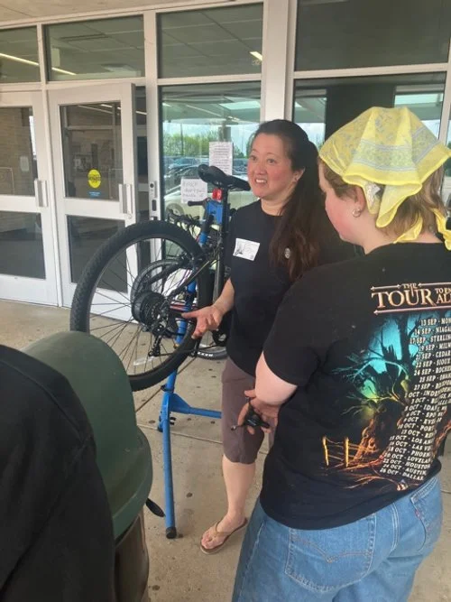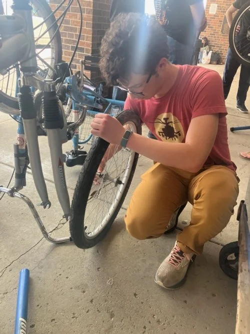 Memorial High Bike Club students and teacher Stella Wu help repair bikes at a Wheels free bike repair event Wheels’ volunteers Jonny, Ben and Nivali work with Madison high school bike clubs teaching students how to maintain and repair bikes. The students get valuable technical and teamwork skills.